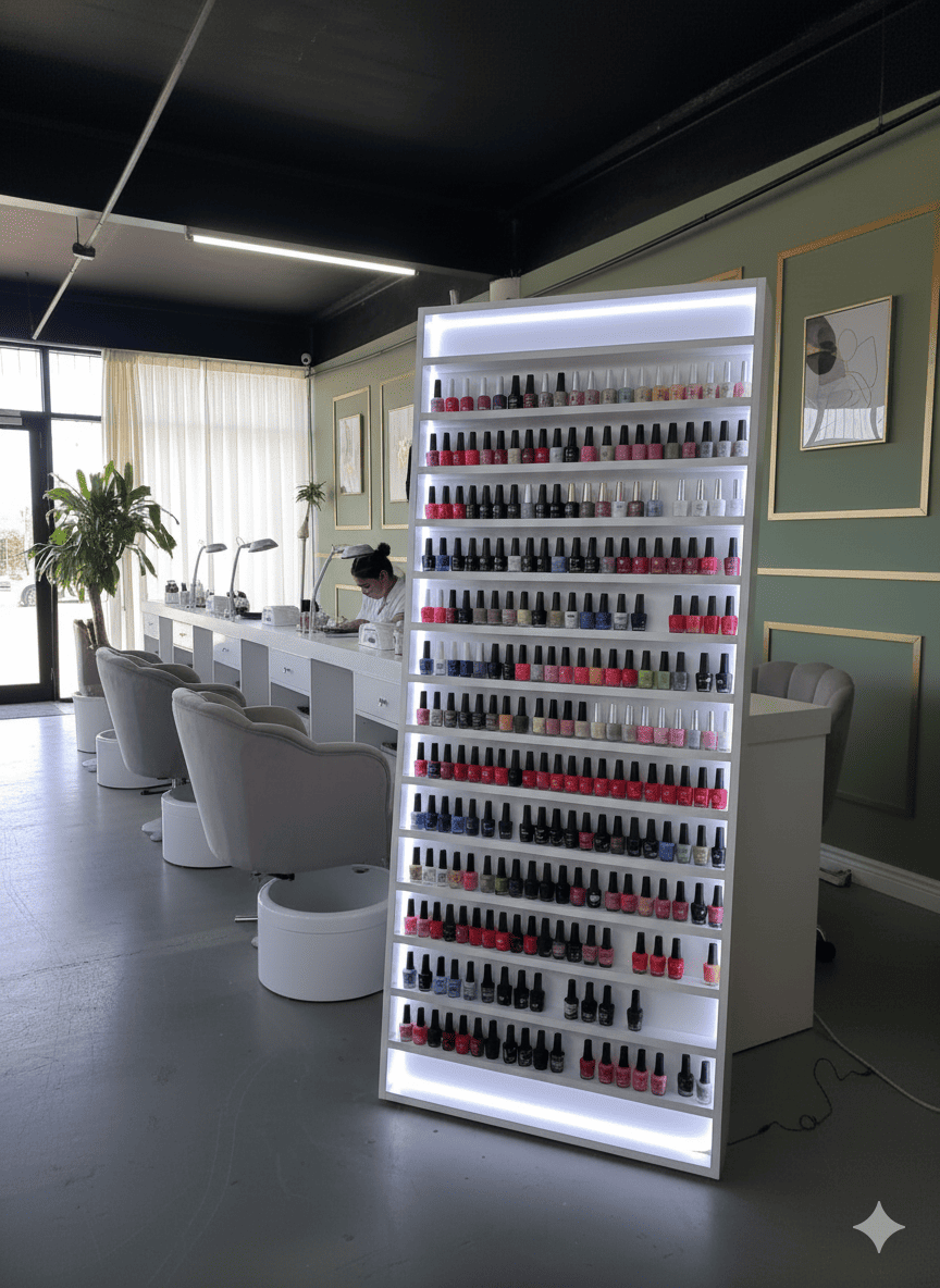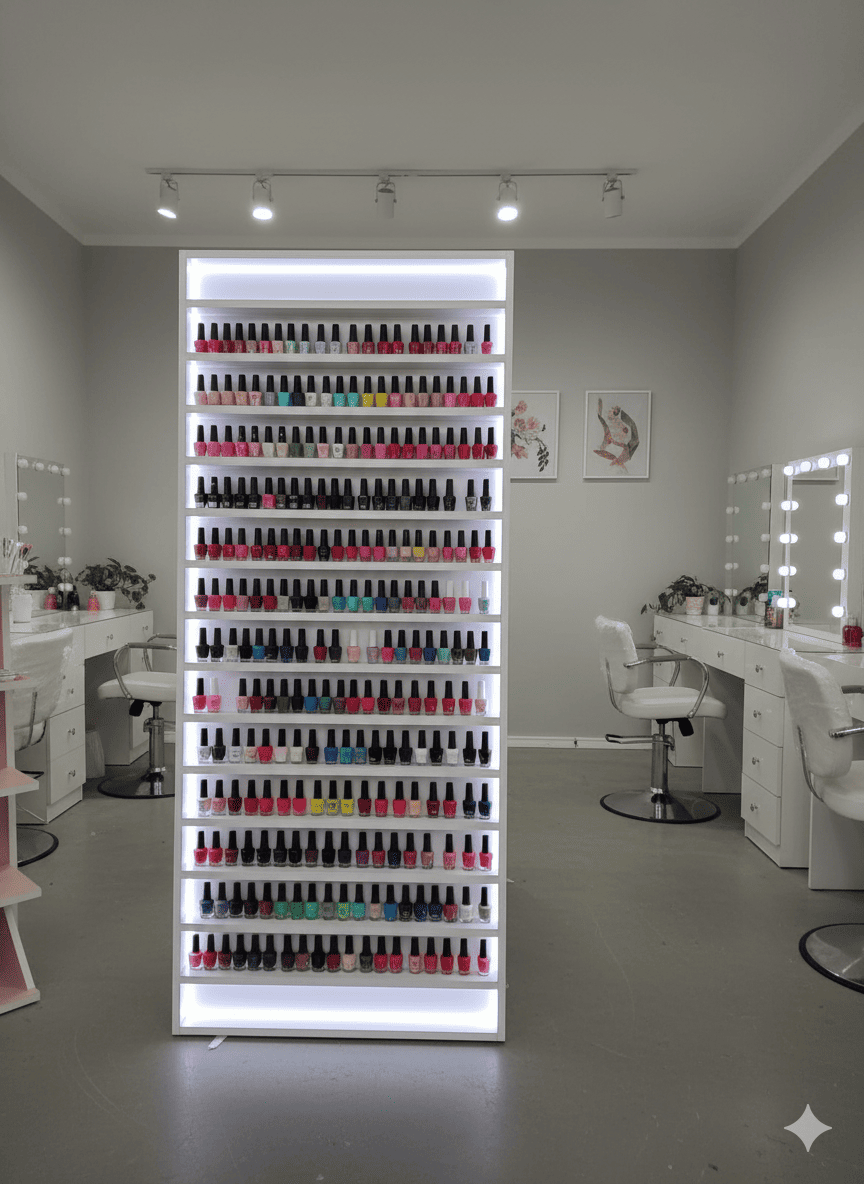 Amplio organizador de esmaltes de 15 niveles con luz. Elegante y duradero, disponible en diferentes materiales y colores.