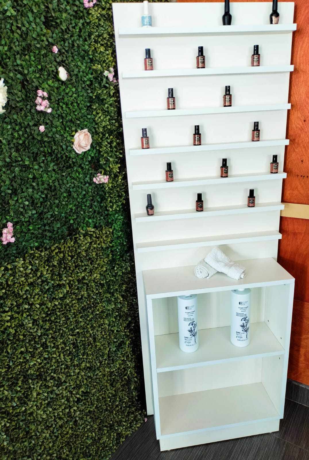 Organizador de esmaltes amplio de 7 niveles y estante de dos compartimientos abiertos. Elegante y duradero, disponible en diferentes materiales y colores.
