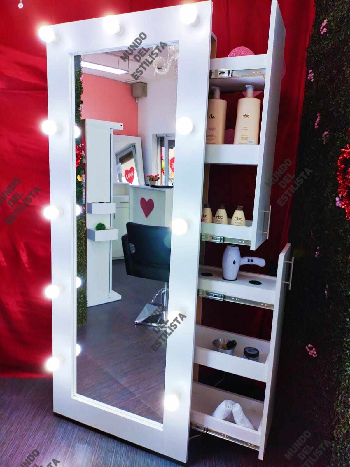 Espejo de cuerpo completo modelo Gladys. Elegante y moderno espejo con dos amplios compartimientos corredizos con portaherramientas para estilista. Disponible en negro o blanco.