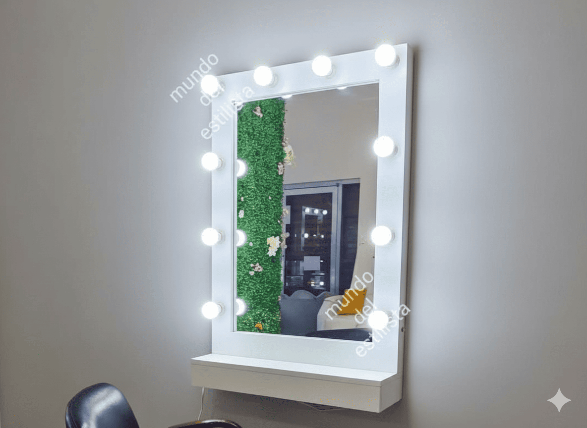 Estación de espejo flotante. Espejo con luces tipo Hollywood, perfecta para maquillaje. Disponible en diferentes materiales y colores.