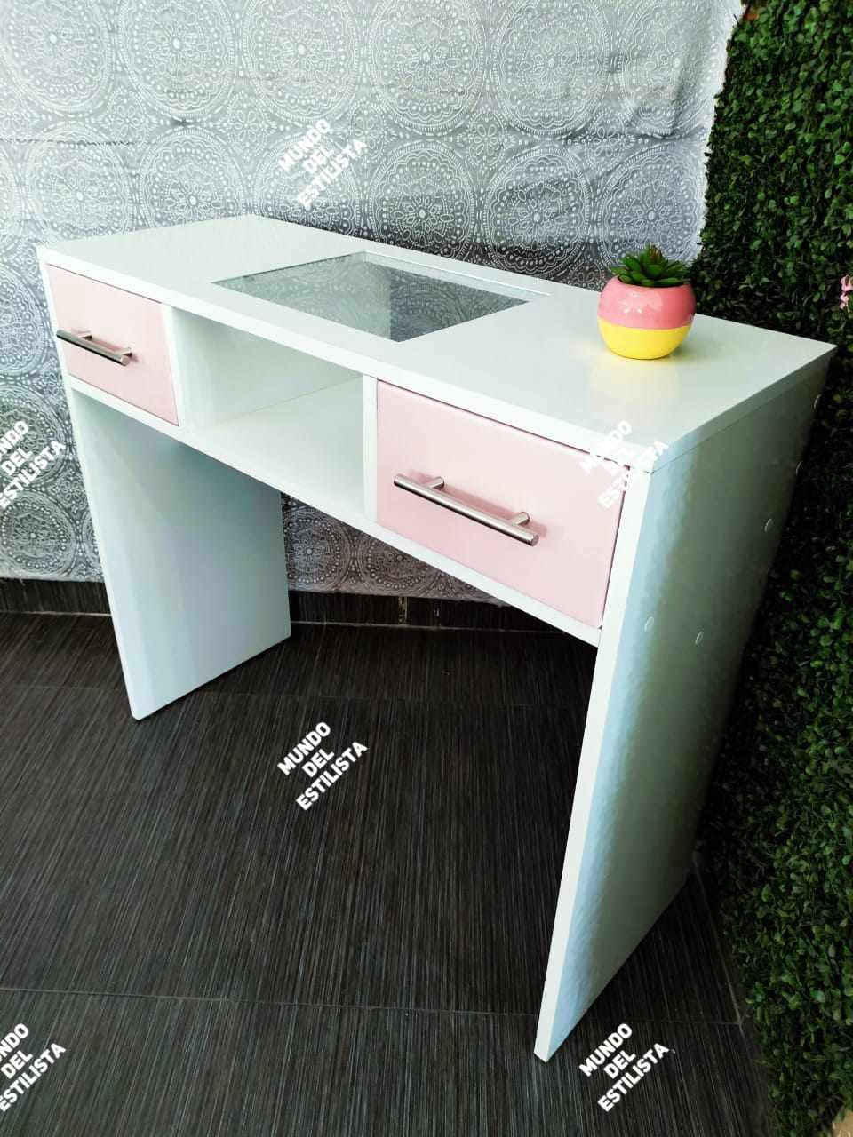 Mesa para uñas modelo París.  Mesa para manicura con cubierta de cristal de 1/4 de espesor y amplios cajones. Disponible en diferentes materiales y colores.