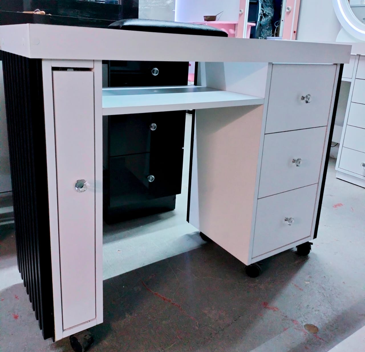 Mesa con lambrín y cubierta de vidrio ahumado. Elegante mesa para manicura con cajones y compartimientos. Disponible en diferentes materiales y colores.
