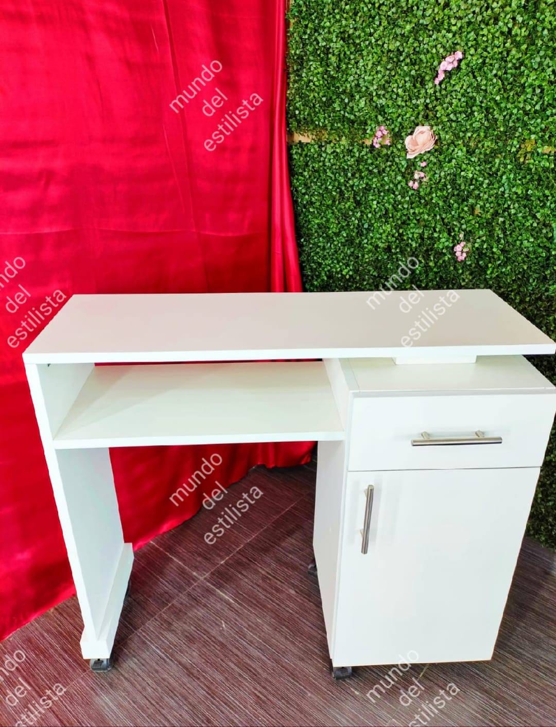 Mesa para uñas modelo Dubai. Resistente mesa para manicura con un cajón y compartimiento. Disponibilidad de diferentes tipos de acabado y colores.