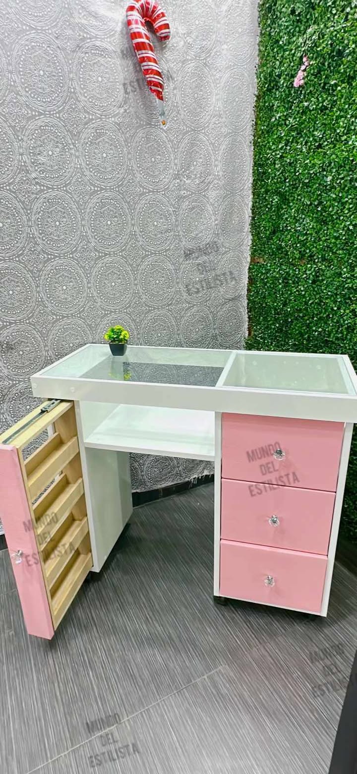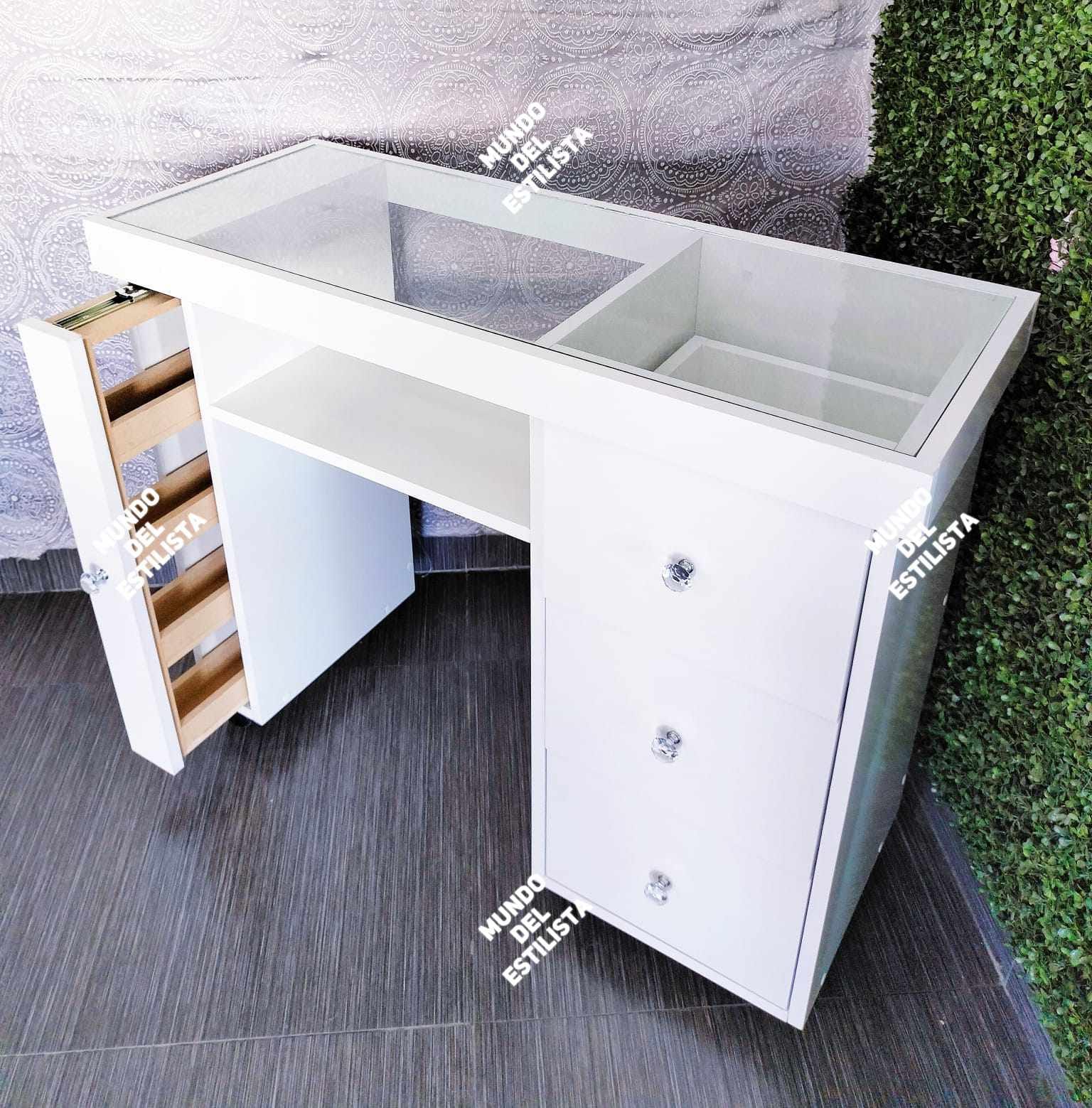 Mesa de manicura cubierta de cristal de 1/4 de espesor y compartimiento vertical para esmaltero.
