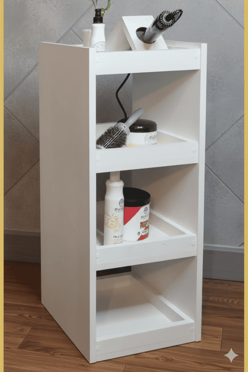 Organizador modelo Huacal con tres amplios compartimientos y espacio para guardar planchas, secadoras, tenazas. Disponible en diferentes materiales y colores.