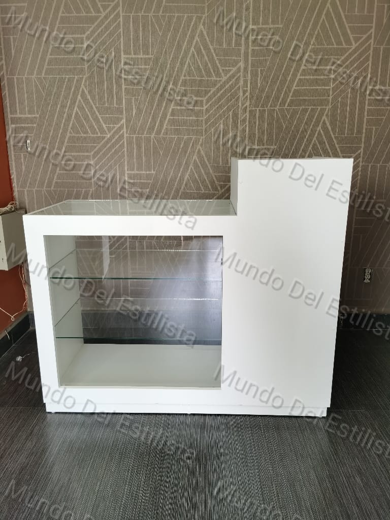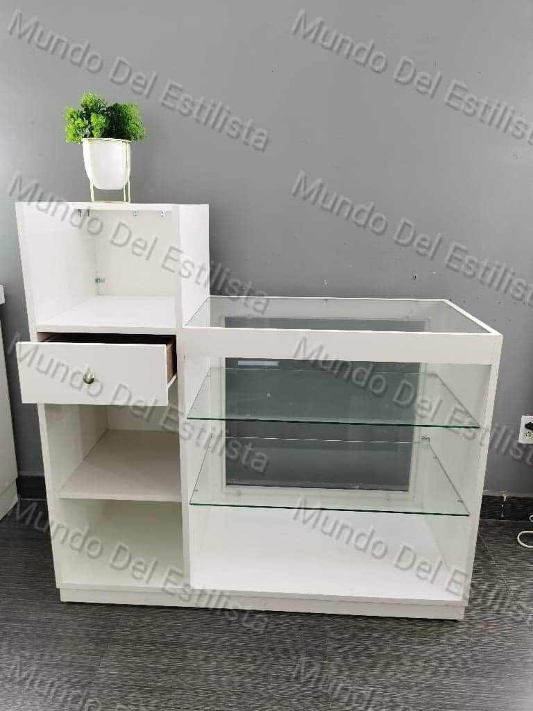 Recepción para estética Elena. Dale la bienvenida a tus clientes con este resistente exhibidor con vitrina para estética con compartimientos.