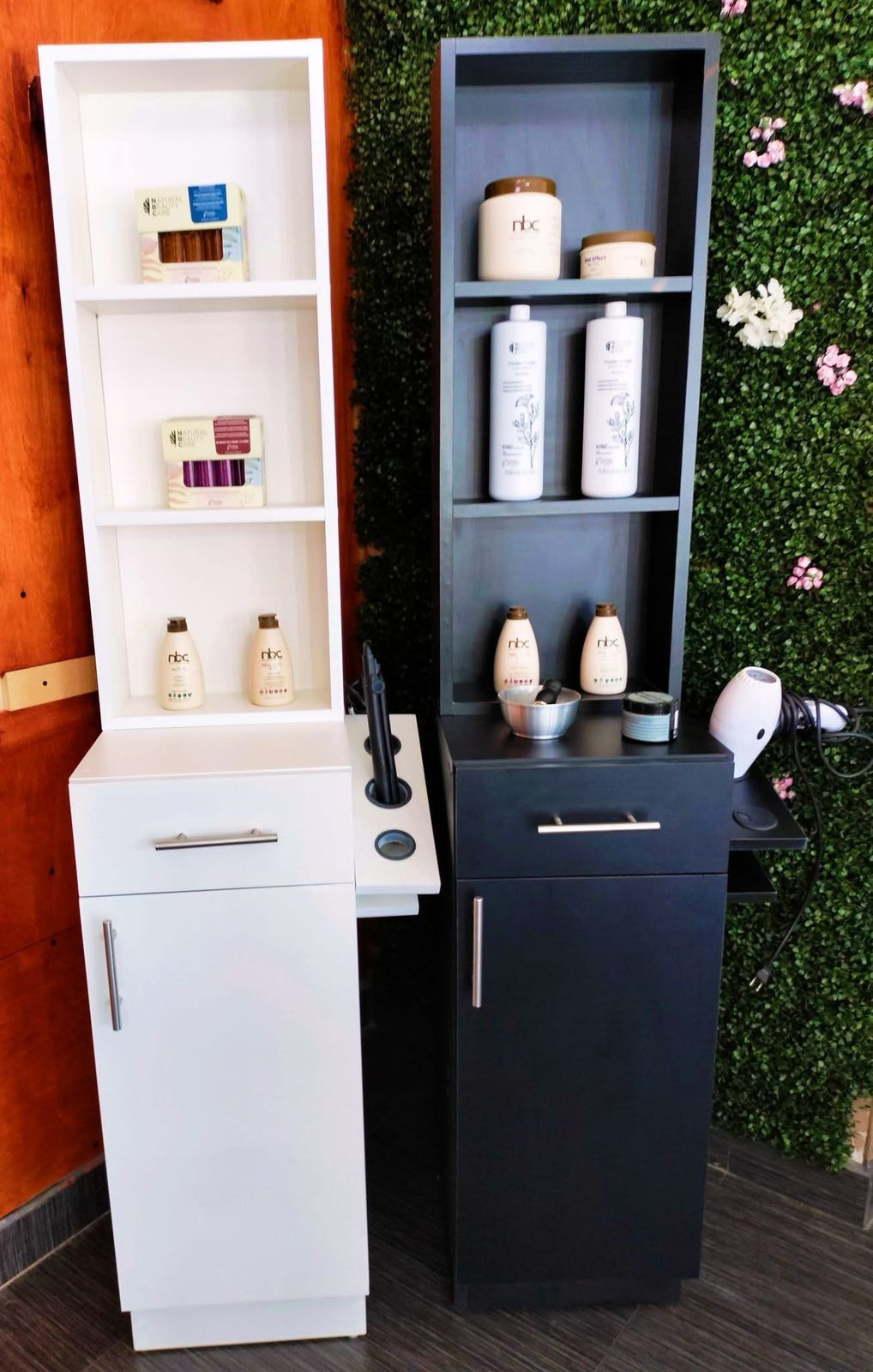 Mueble con repisero modelo Barber. Repisero con mueble auxiliar, cajones, 3 compartimientos abiertos y portaherramientas para estilista.