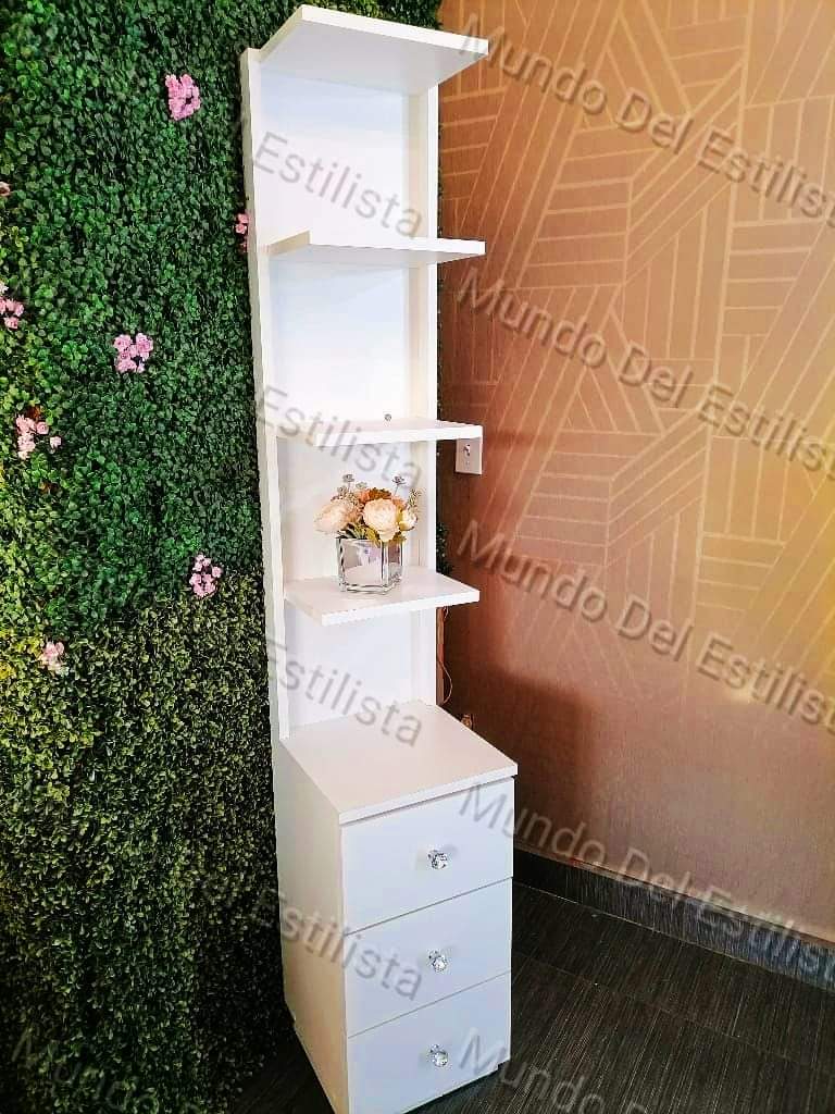 Mueble repisero modelo Lucya. Elegante repisero vertical con 3 amplios cajones, manijas tipo diamante y organizador de 4 niveles.