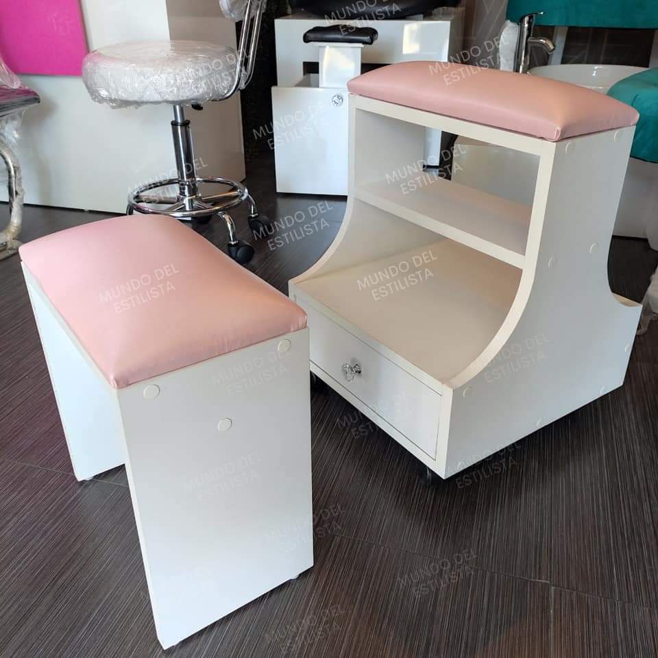Práctico y resistente mueble reposapiés para pedicura, acolchonado, con compartimiento y cajón.