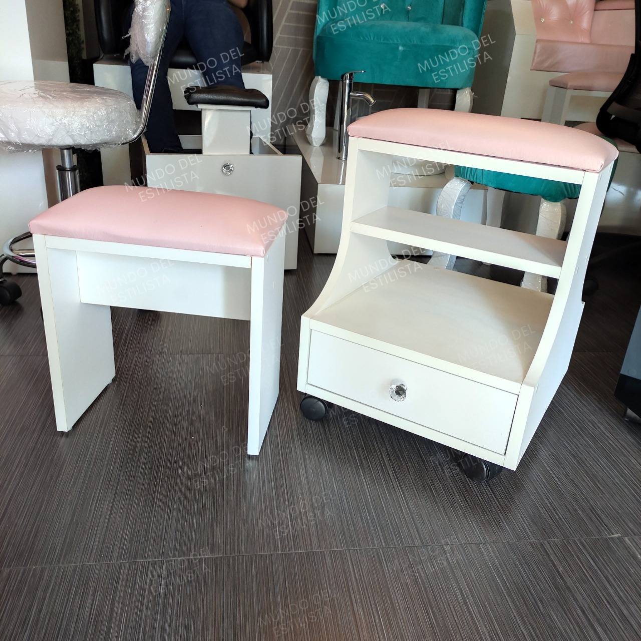 Reposapie para pedicure modelo caballito Dany. Práctico y resistente mueble reposapiés para pedicura, acolchonado, con compartimiento y cajón.