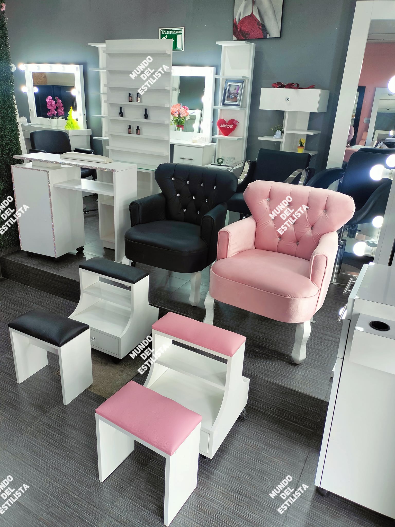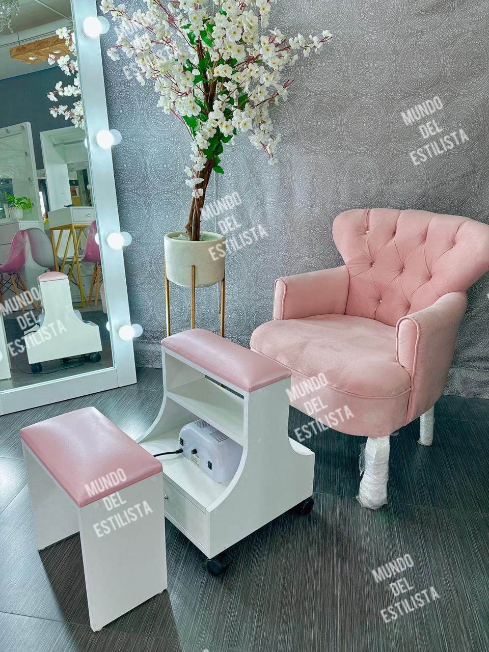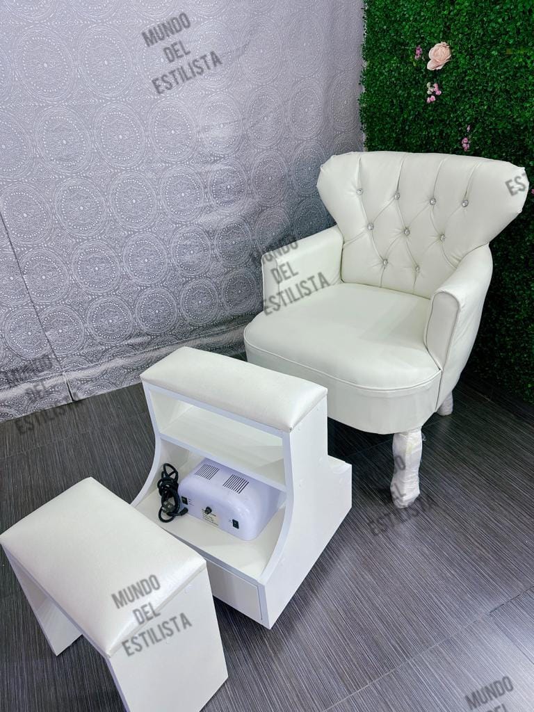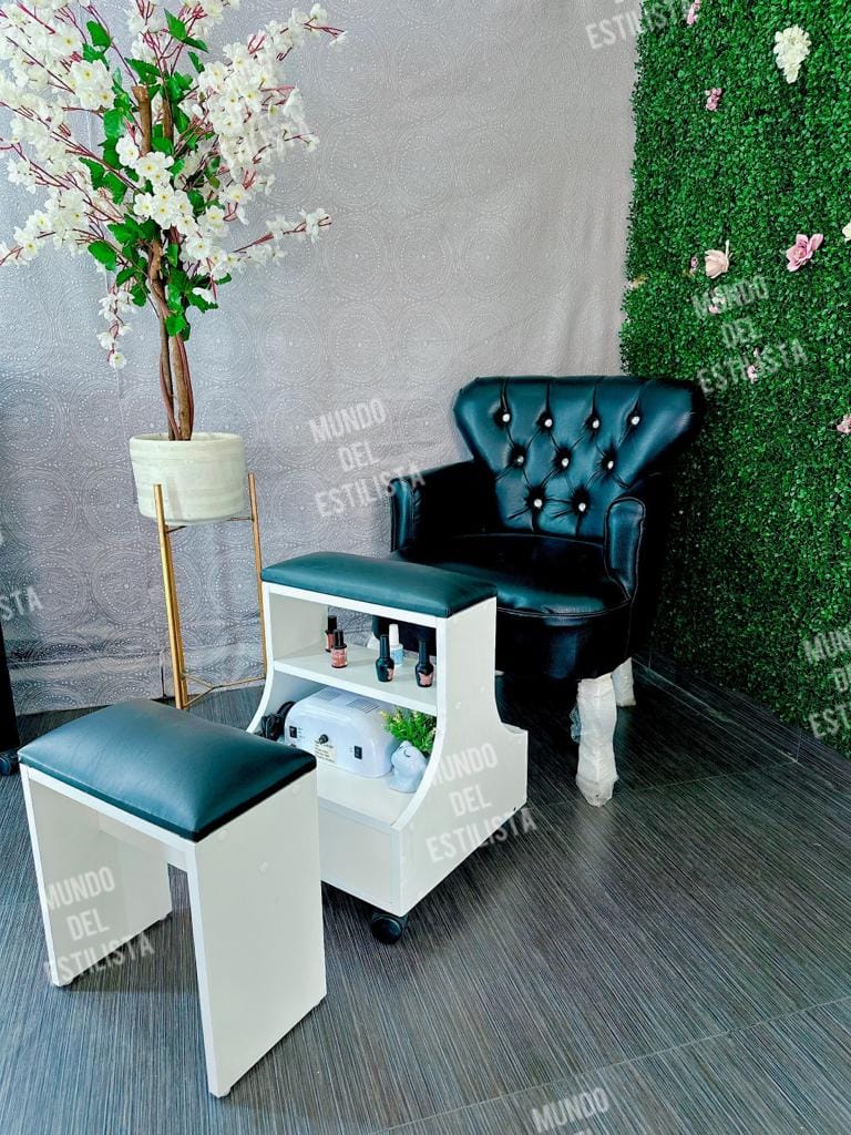 Set Dany y sillón Luis XV para pedicure spa. Elegante y práctica estación para pedicure con sillón abotonado, banquito y descansa pies con compartimientos.