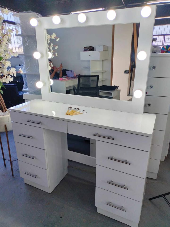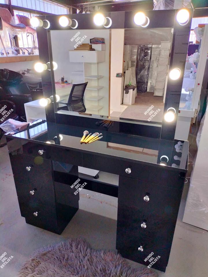 Vanity con focos y manijas tipo diamante. Alto brillo.