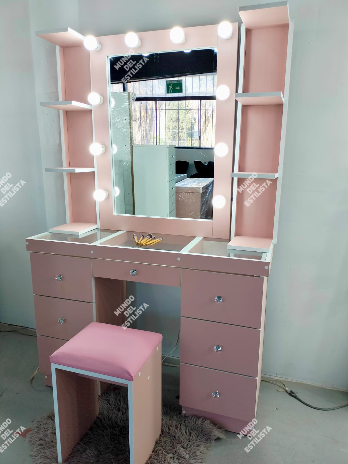 Vanity modelo Diamonds dos Torres. Elegante mueble organizador con espejo, cuenta con focos tipo Hollywood, 2 torres con repisas y 7 amplios cajones. Disponible en diferentes colores y materiales
