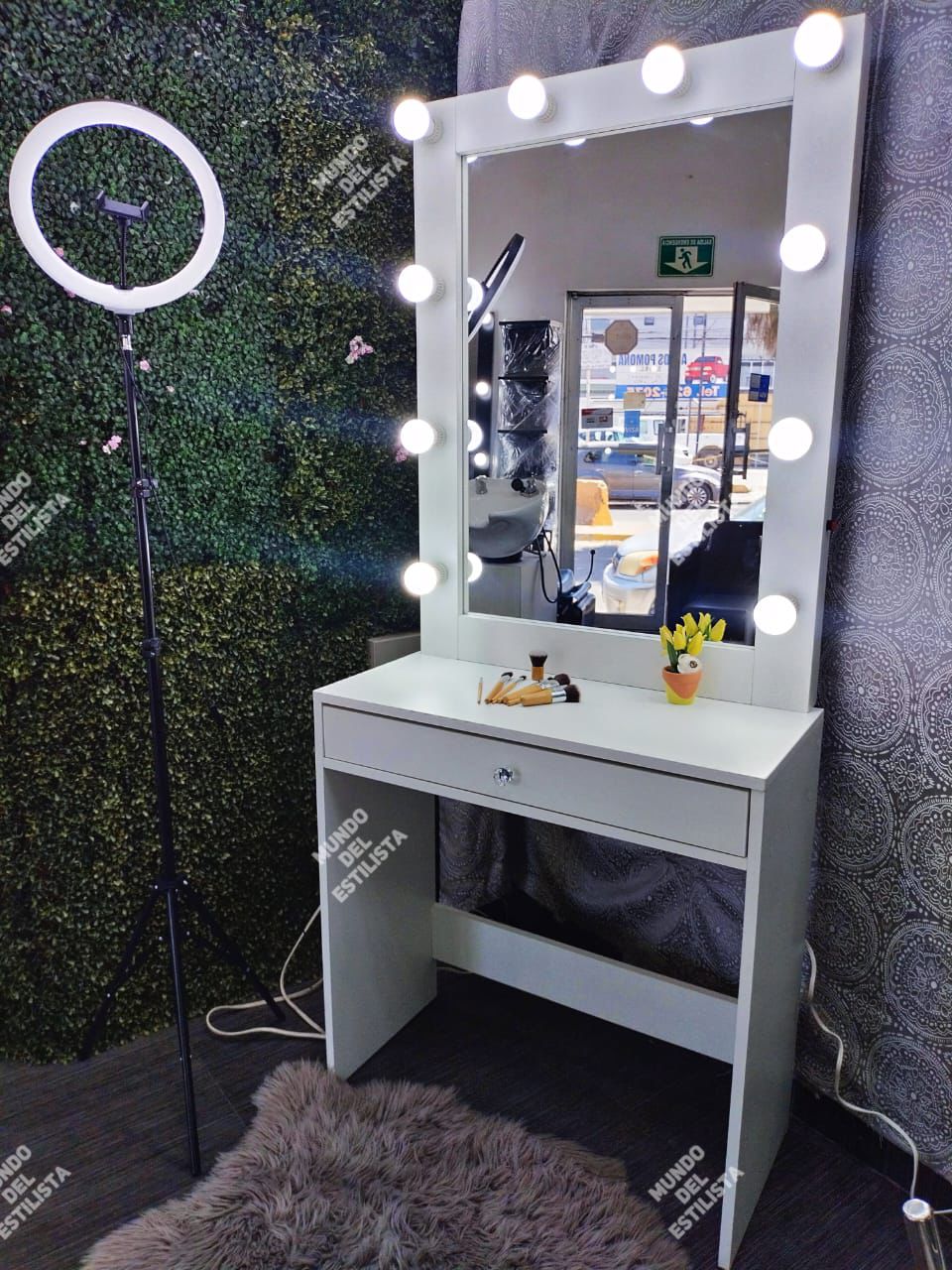 Vanity modelo Petite. Económico mueble organizador con espejo, cuenta con focos tipo Hollywood y 1 amplio cajón. Disponible en diferentes colores y materiales
